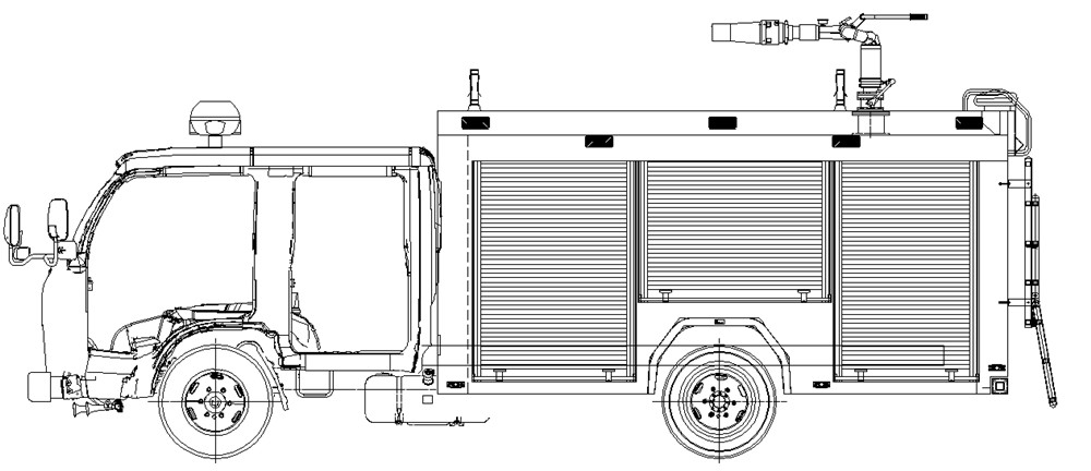 | 總體布置 | 整車由消防員乘員室和車身兩大部分組成,車身布置采用內(nèi)藏罐式結(jié)構(gòu),左右兩側(cè)為器材箱,中部為水罐,器材箱后部為泵房。 |